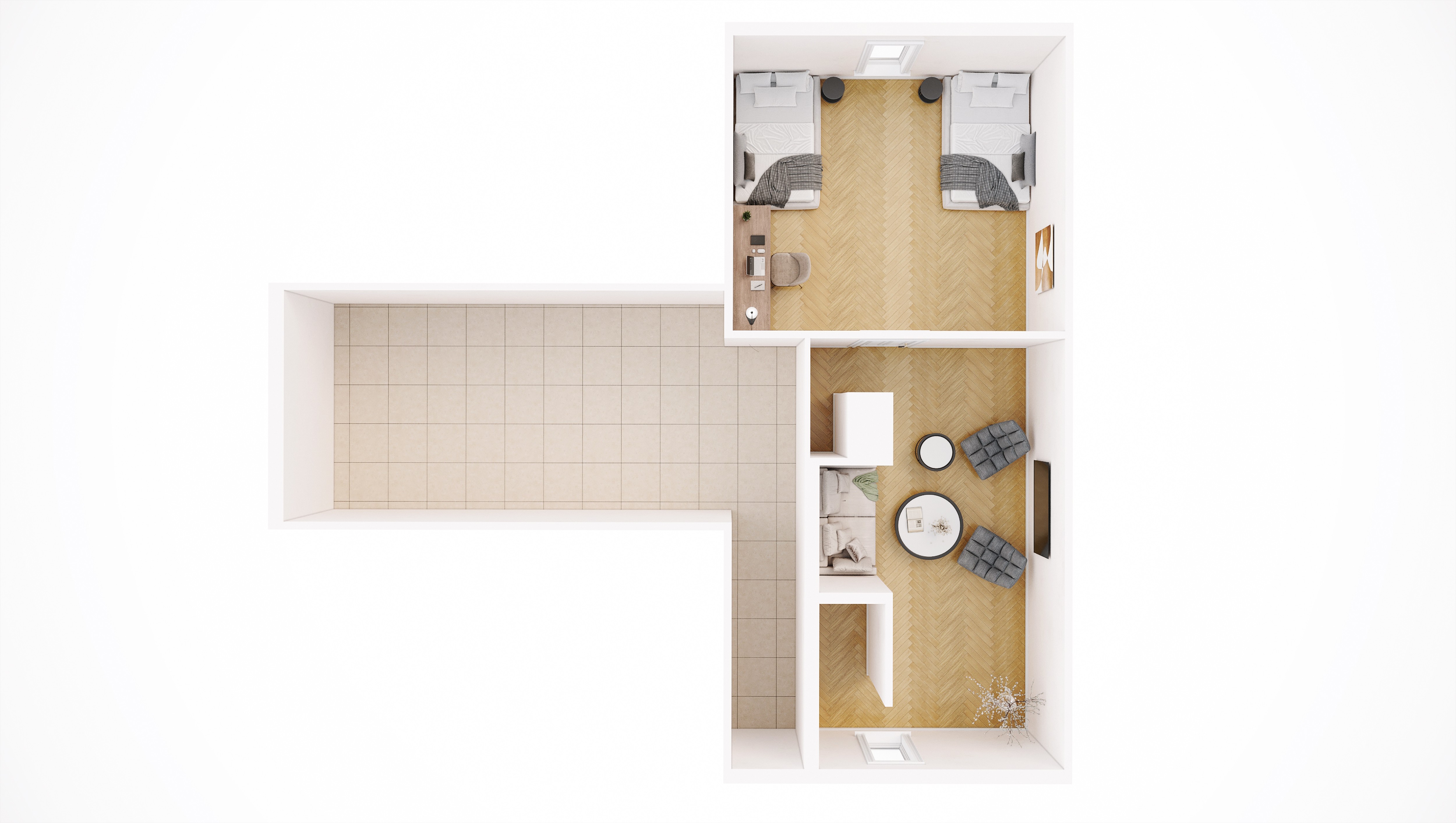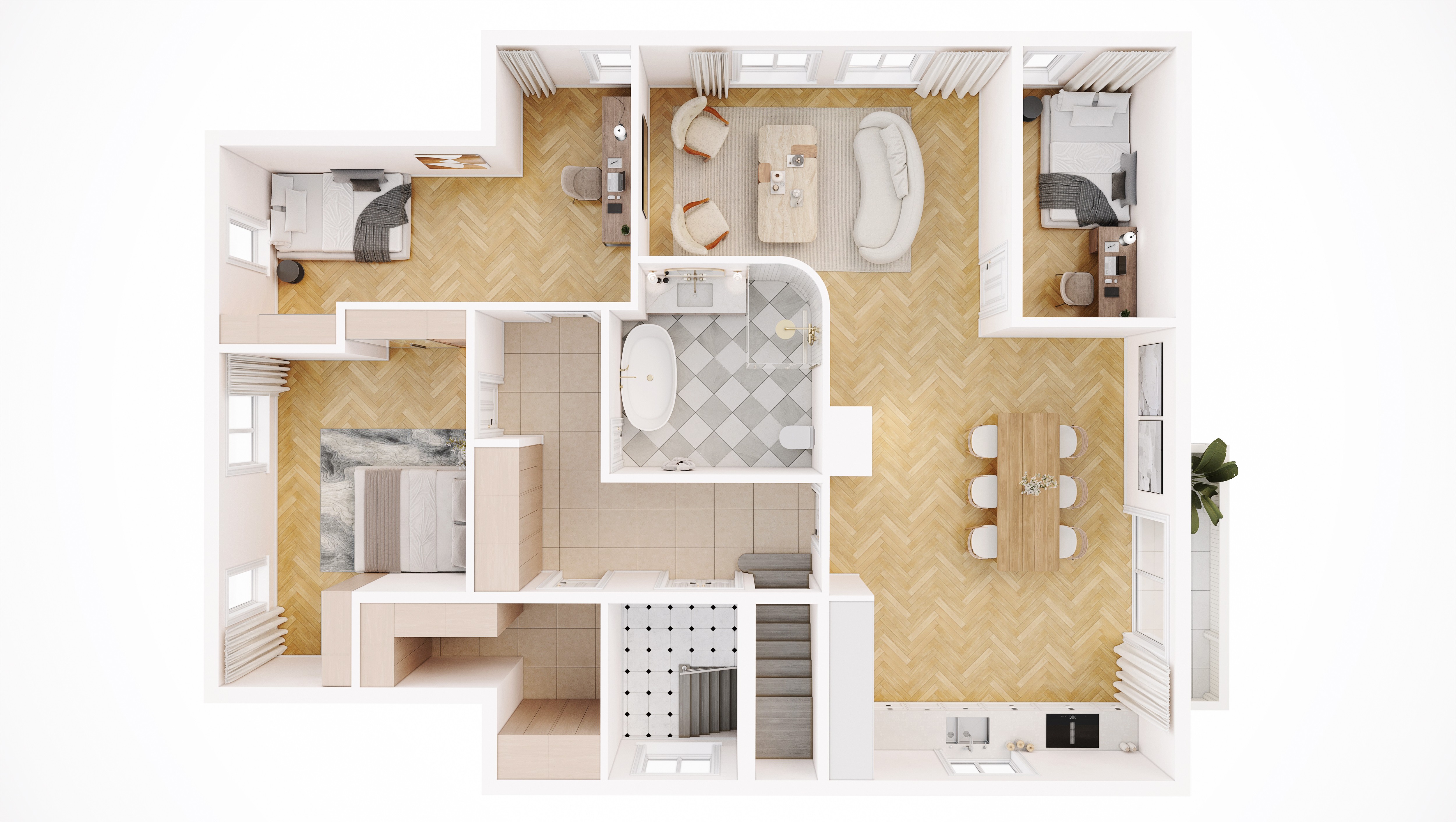Illustrasjonene i markedsføringen viser hvordan boligene er planlagt ferdigstilt, basert på gjennomarbeidede konsepter og materialvalg.